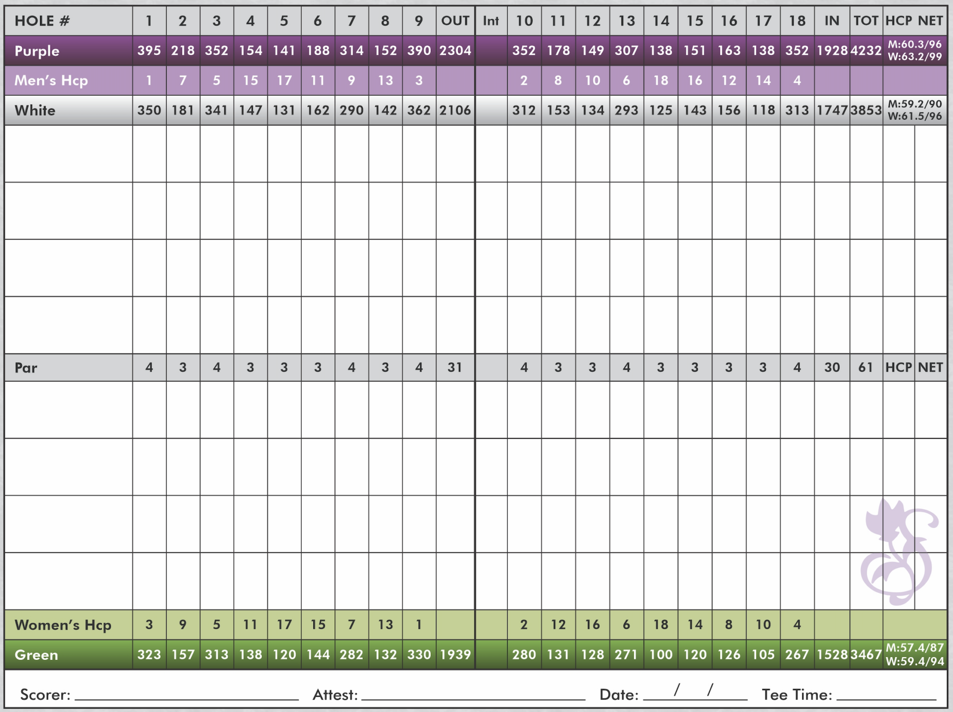 With strategically placed bunkers, and two large lakes that come into play on 6 holes, the course can test your skill without being over-powering. Featuring 4,231 yards of golf from the longest tees and 3 sets of tees to choose from, you are sure to find a set-up that you will enjoy for years to come.